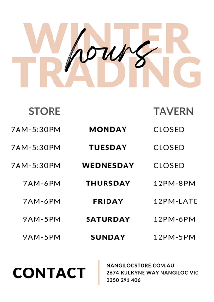 Only a 35 minute drive from Mildura, located in the quiet farming community of Nangiloc, Victoria. The Nangiloc Store has all your needs covered from home cooked meals, groceries, Australia Post, fuel and a bottle shop. While in the Tavern, eat in and be surrounded by the largest mural in Sunraysia. If you are camping and need some supplies, driving through to the Hattah/Kulkyne National Park and need some fuel or a coffee, call in and see our friendly staff.